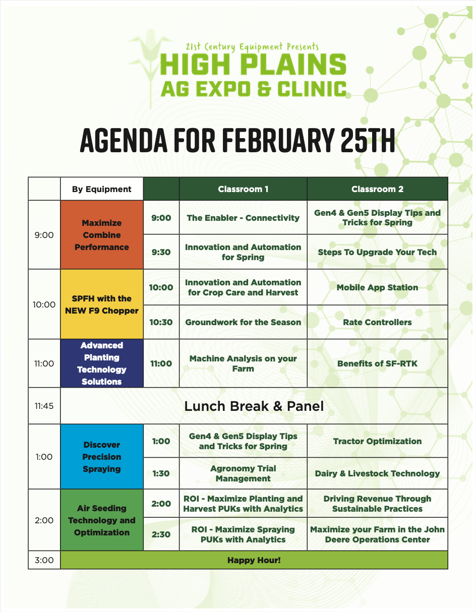 Immerse yourself in the forefront of precision agriculture and learn to leverage the latest advancements in John Deere’s products and technology in our third year of this exciting clinic at the High Plains Ag Expo 2026!